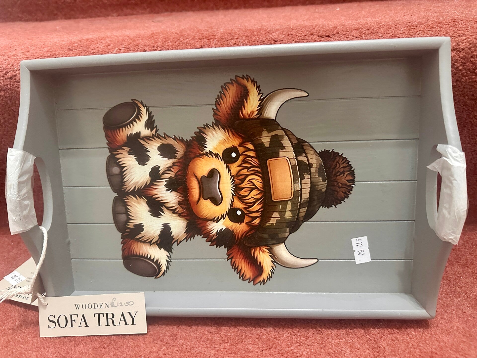 This grey wooden Sofa tray with cheeky Cow wearing a woolly hat, has spring loaded legs which fit securely over the arm of a chair or a sofa.